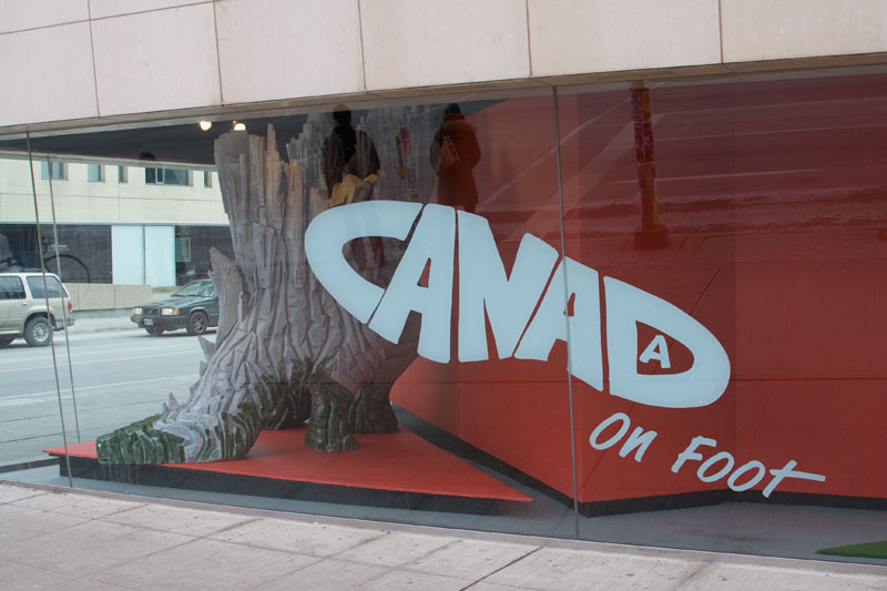Here’s an eye-catching sign on the display window at The Bata Shoe Museum. The six letters of “CANADA” are snugly fitted together to form a gigantic footprint. What does this puzzle-like graphic say about our national identity?