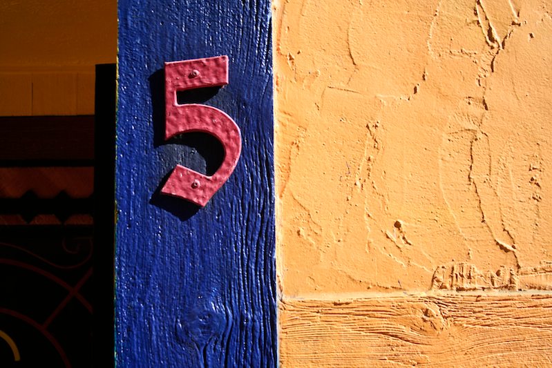 Here you see a doorpost at the entrance to a Spanish restaurant. Stucco, wood, metal, paint, screws: the construction is simple yet forceful and the saturated primary colours create a ferocious intensity.