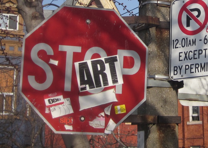 If you’ve been reading this blog for a while, you know that I have a thing for revised signs. Here’s my new favourite: a STOP sign that someone transformed into its opposite with the slap of a sticker.