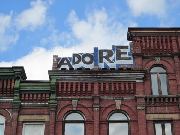 This word fits neatly into the stair-like shape of the facade. I appreciate the command because it’s so open-ended: Adore what? Adore whom? We’re left to fill in the blank ourselves.