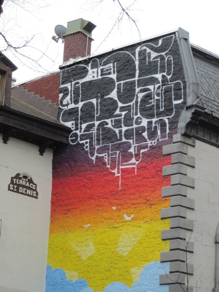 This is the upper part of a mural I spotted on Rue St. Denis while in Montreal recently. A cloud of glyphs pulsates with life.