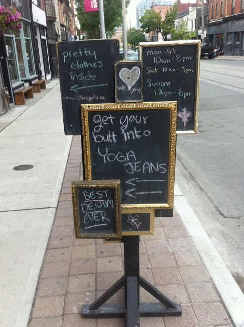 Shopgirls is a Parkdale clothing boutique that amps up the appeal of chalkboard signs by creating a whole assemblage of them. I get the feeling they would have kept right on going, but the structure likely wouldn’t support much more.