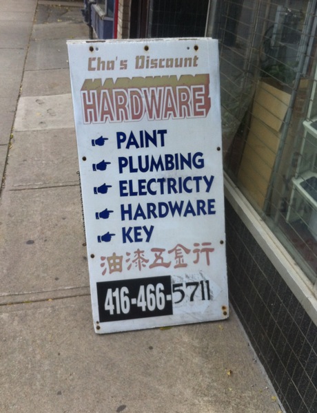 Chunky, three-dimensional letters make up the word “hardware” and small, pointing hands act as bullets calling attention to the store’s offerings. Bilingualism widens the sign’s audience.