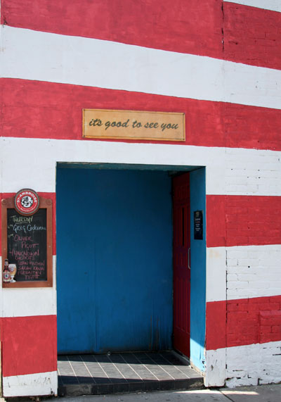 This sign has a split personality: one part polite and one part hostile. I love the contrast between the delicate script and the big red caps.